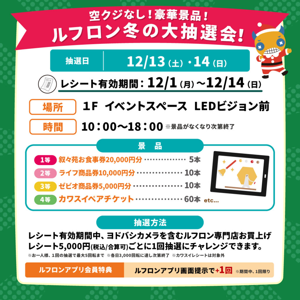 さらに、ルフロンアプリをお持ちのお客様は、プラス1回抽選ができます!(1日1回限り)