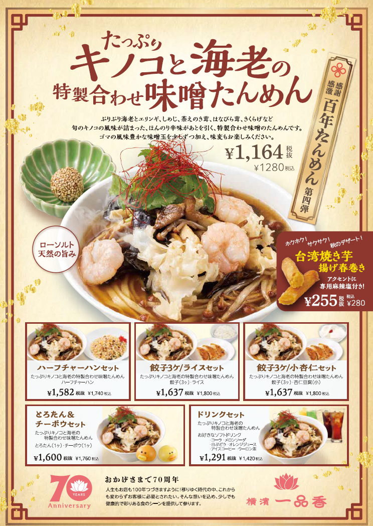 ぷりぷり海老とエリンギ、しめじ、茶えのき茸、はなびら茸、きくらげなど旬のキノコの風味が詰まった、ほんのり辛味があとを引く特製味噌のたんめんです。